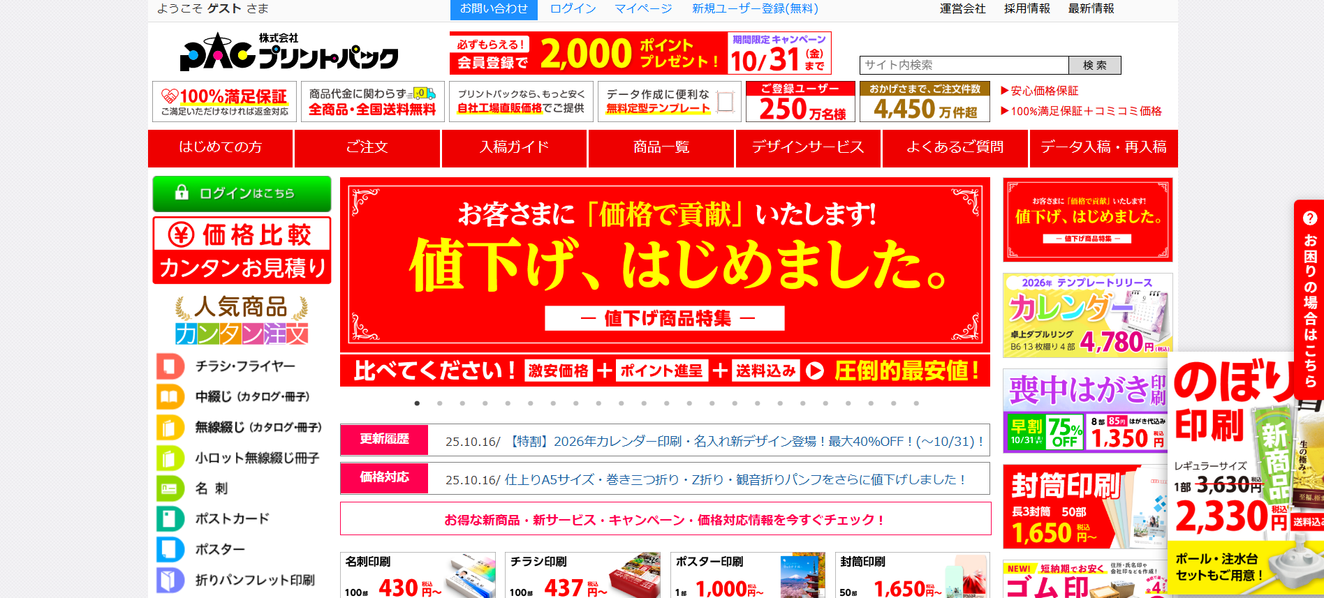 プリントパックは、業界最大手のネット印刷通販サービスを提供する企業です。自社工場による一貫生産体制により、高品質・低価格・短納期を実現しています。チラシ、名刺、ポスター、冊子、カレンダー、DM、パッケージ印刷など、豊富な印刷商品ラインナップを展開しており、特殊印刷やノベルティにも対応しています。