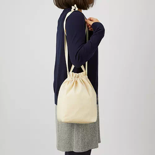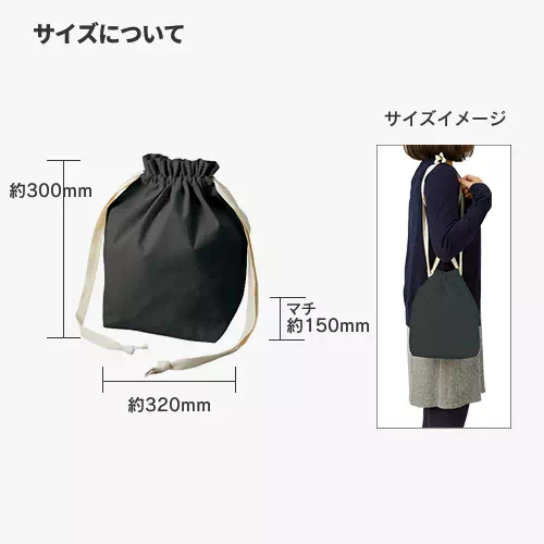 肩掛け・手持ち・巾着と3WAYで使える使い勝手の良さも魅力です。シンプルな素材なので、印刷するデザインを一層引き立てます。シーチング素材と比較して中身が透けにくく、かつやわらかさも残した5オンスのコットン素材です。色違いで無漂白のナチュラルもございます。