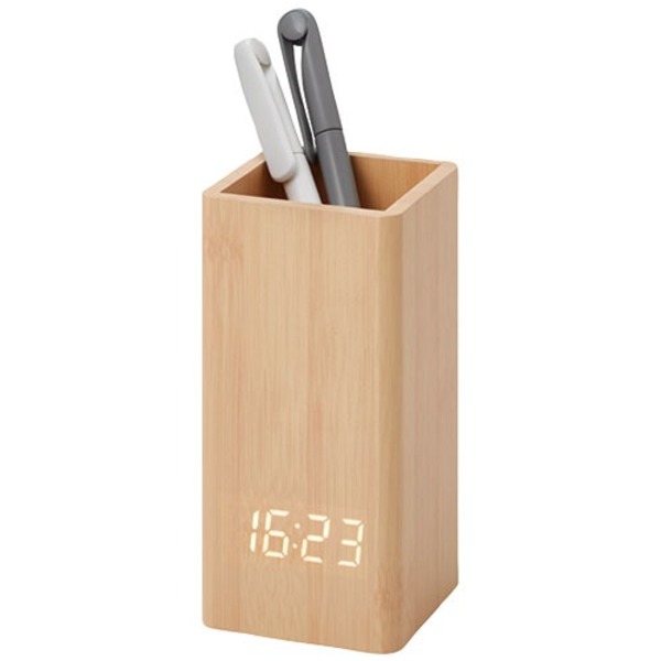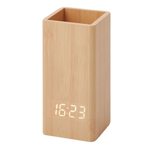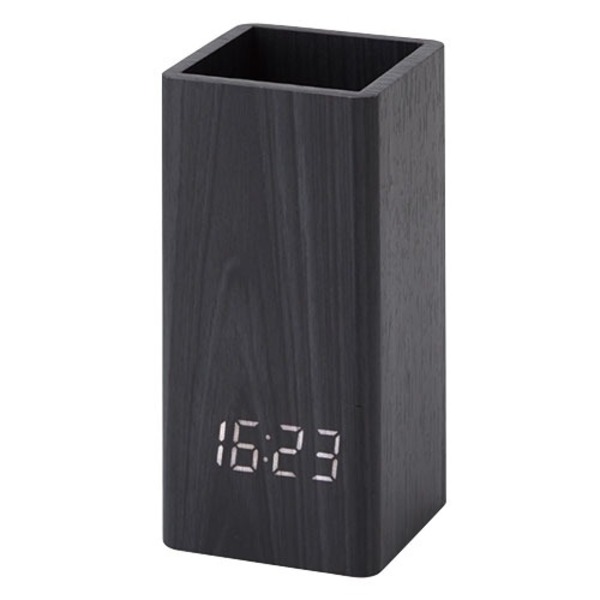 ペンスタンド機能の付いた、スタイリッシュな木製LEDクロック。