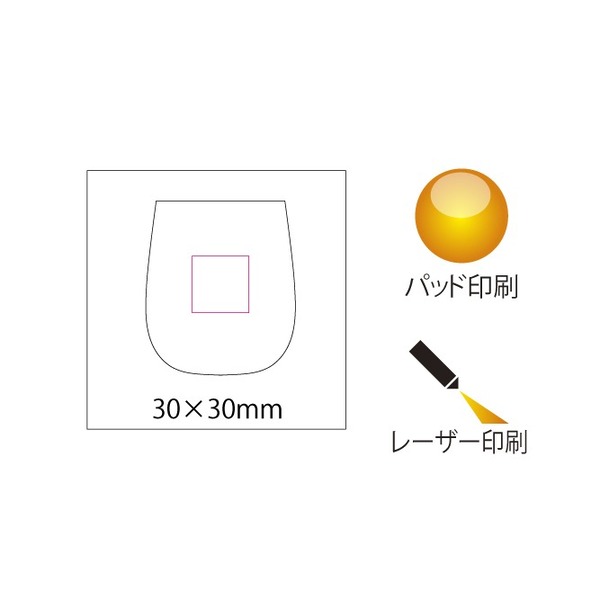 印刷・範囲 | ≪カップ本体≫ パッド印刷:30×30mm レーザー印刷:30×30mm ≪箱≫ 箔押し:70×30mm |