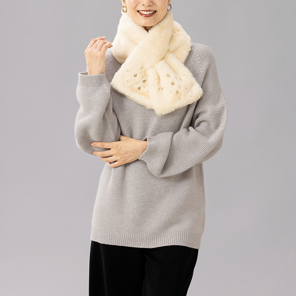 肌触りよく、ボリュームのあるあたたかいファーマフラーです。
