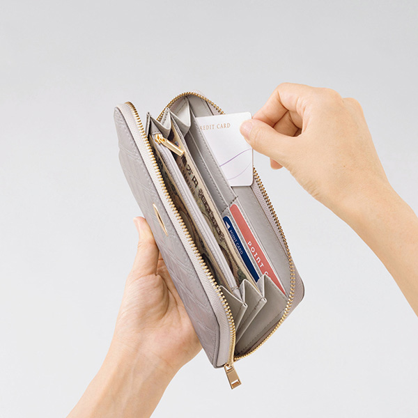 高級感あるエンボス加工のロングウォレットです。多数のポケットが魅力的。