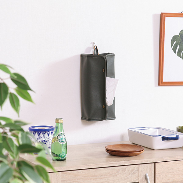 高級感あるレザー調のティッシュケースです。詰め替えが便利なボタン開閉タイプ。ループ付きで吊り下げて使うこともできます。