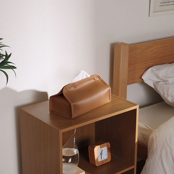 高級感あるレザー調のティッシュケースです。詰め替えが便利なボタン開閉タイプ。ループ付きで吊り下げて使うこともできます。