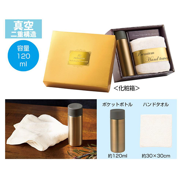 ゴールドパッケージに納めた、おでかけ時にセットで使えるミニボトルとハンドタオルのギフトセット。