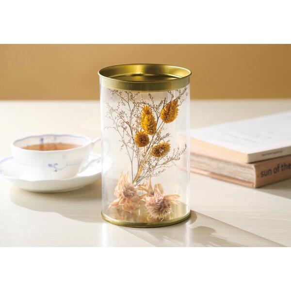 スタイリッシュなゴールドの蓋が印象的な円筒形のクリアケースに、ニュアンスカラーのブランケットを入れました。