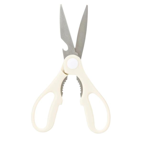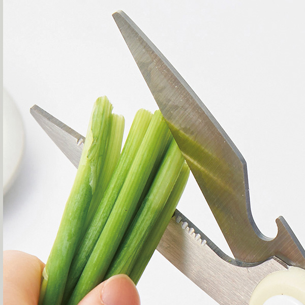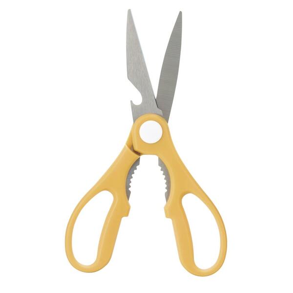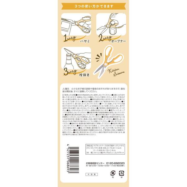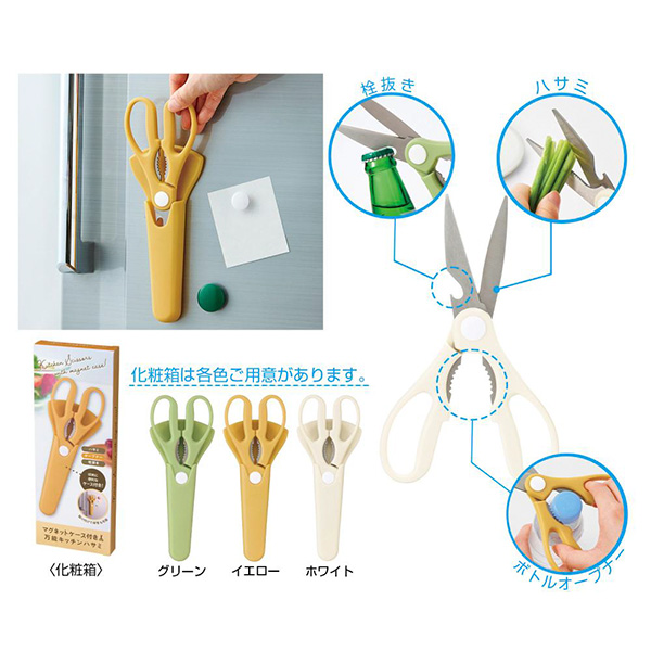 キッチン作業がはかどる万能はさみ。冷蔵庫にピタッとくっつけておけるマグネット付きのケースとセットです。