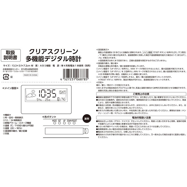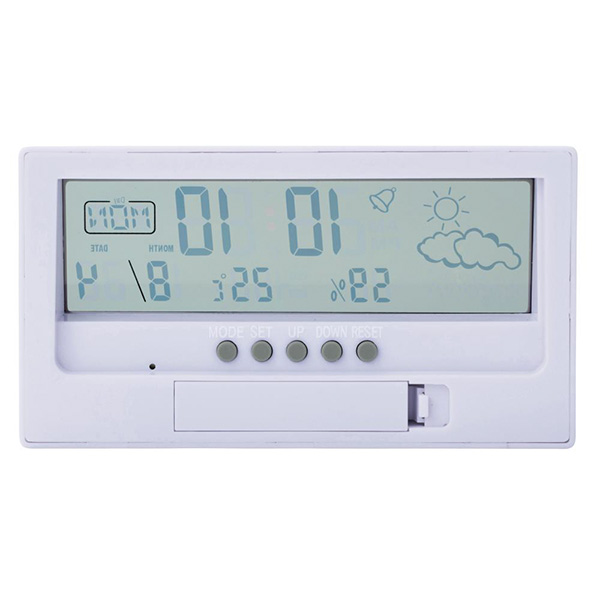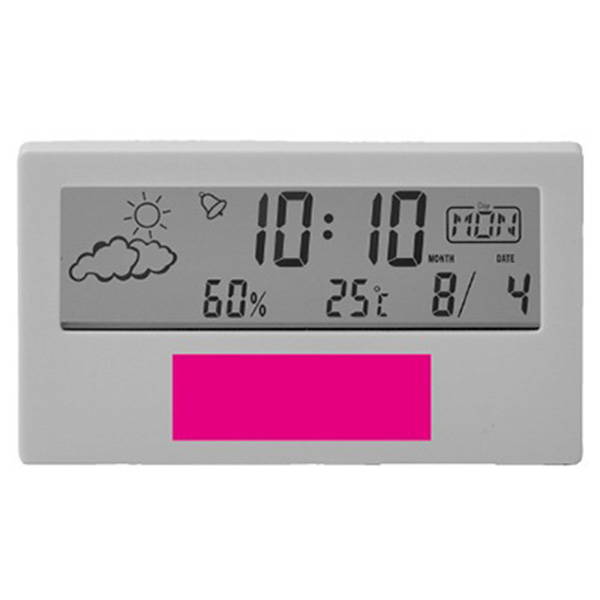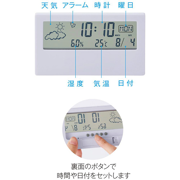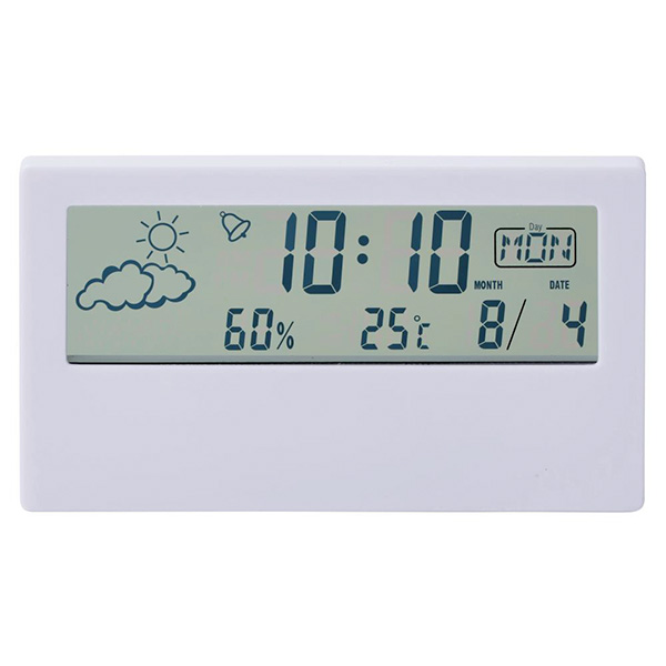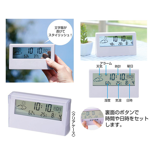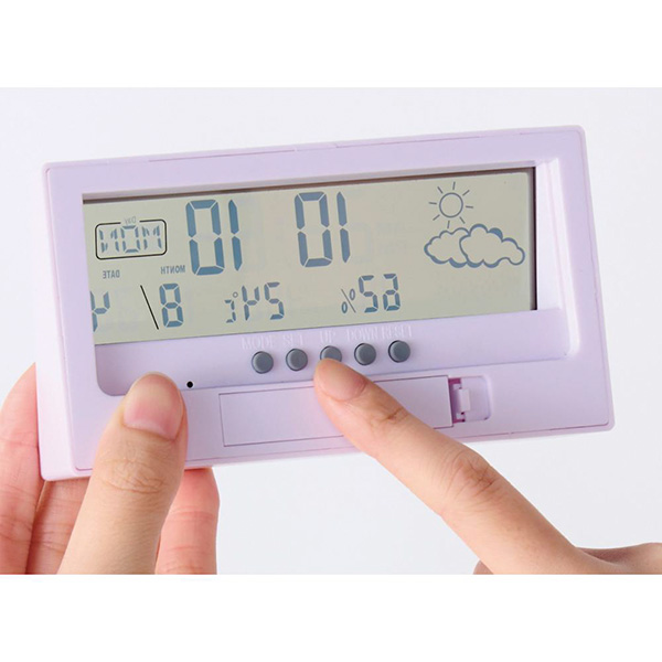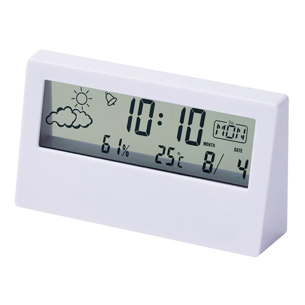 時計・日付・温湿度・天気の機能が付いた多機能なデジタル時計。