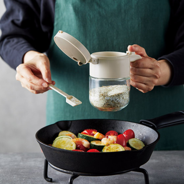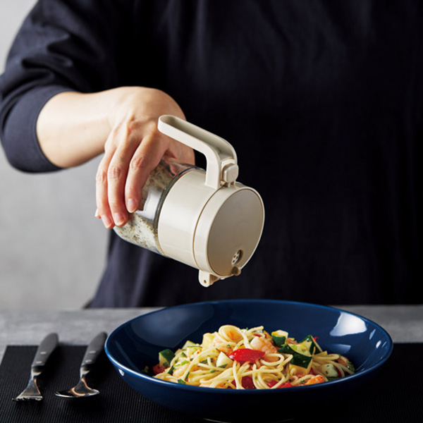 フタを開けてスプーンですくうだけでなく、逆さまにして直接振りかけることもできる、