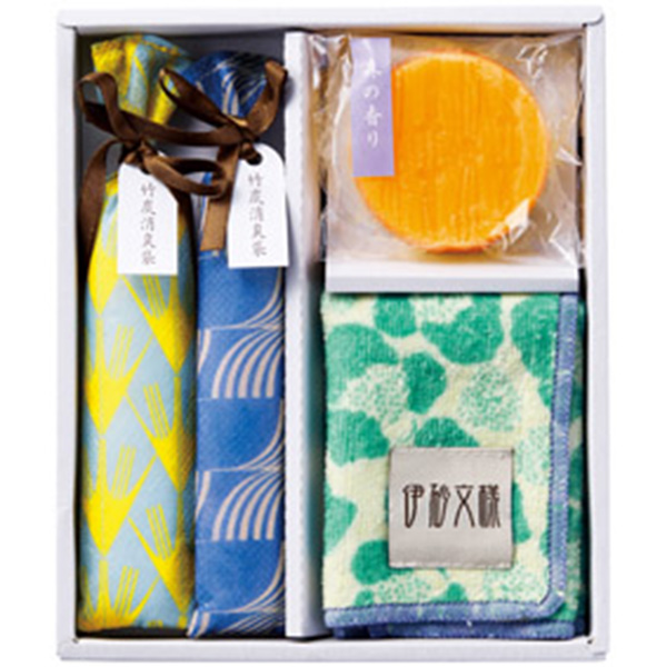 竹炭消臭袋×2、爽やかな森の香りの固形石鹸、綿100%ハンカチタオルの和柄ギフト4点セット。
