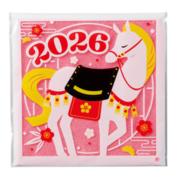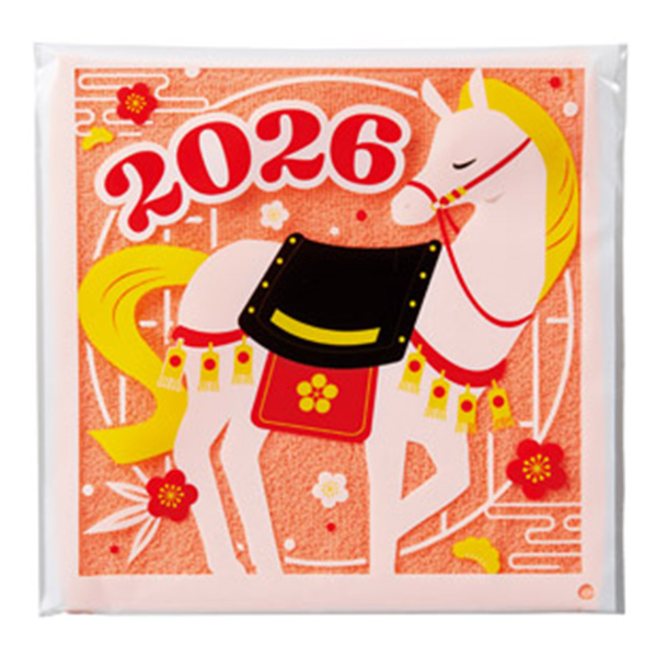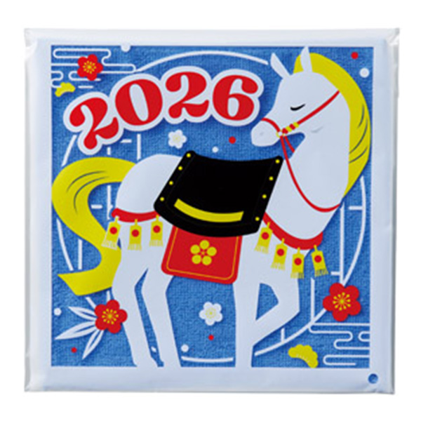 干支の馬イラストが華やぎを添えるパッケージ、実用的で貰ってうれしいハンカチタオルです。