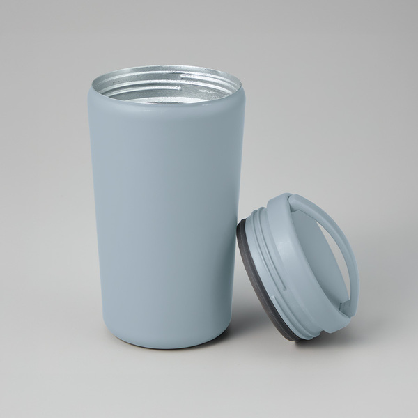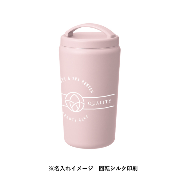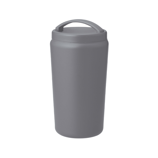 ハンドル付きで持ち運びがしやすく、現代のオフィスシーンにも馴染むような色合いのタンブラーです。