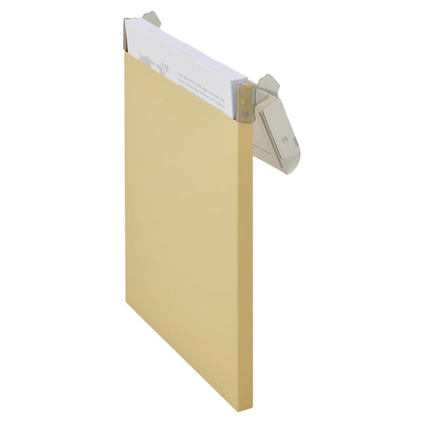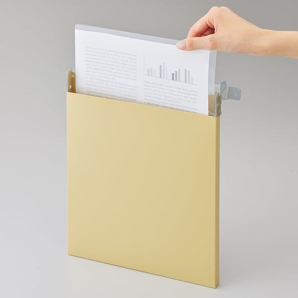 フタが大きく開いて、書類の出し入れがスムーズ。A4クリヤーホルダーが収納できるサイズ。