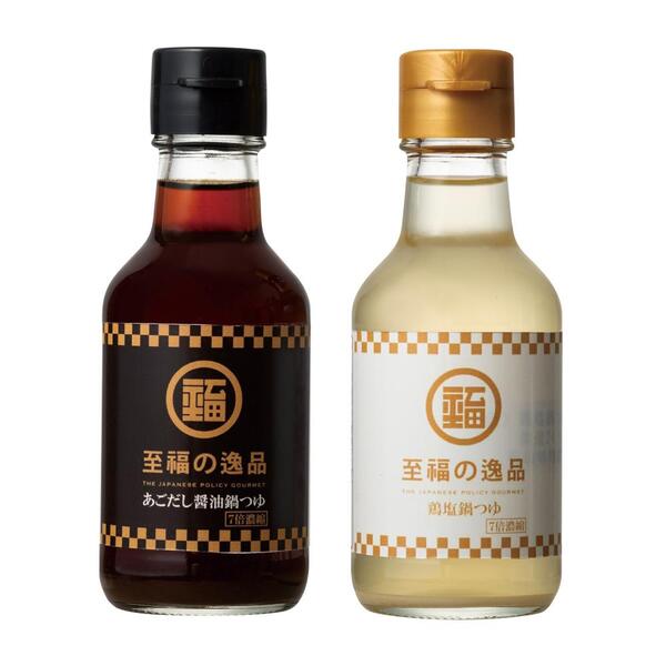 あごだし醤油と鶏塩だしの2種類のお鍋が楽しめる贅沢な鍋つゆセットです。
