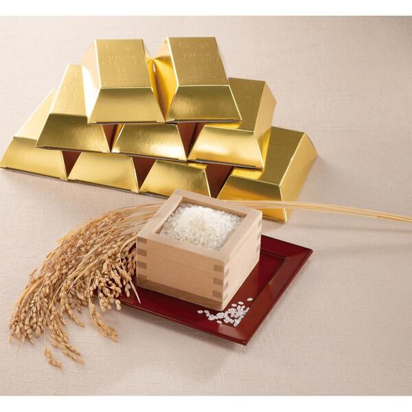 金塊型のパッケージに100gのお米をセット!店頭に積み上げれば注目度抜群のPOPになります。