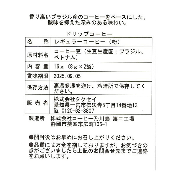 | 備考 | 【発注単位】 150個以上50個単位でのご注文になります。 【軽減税率8%】 ※自動見積では消費税10%で表示されますが、商品は軽減税率8%となります。 送料が発生する場合は、送料のみ消費税10%となります。 <セット内容> ドリップコーヒー8g×2 賞味期間/420日間(常温) |