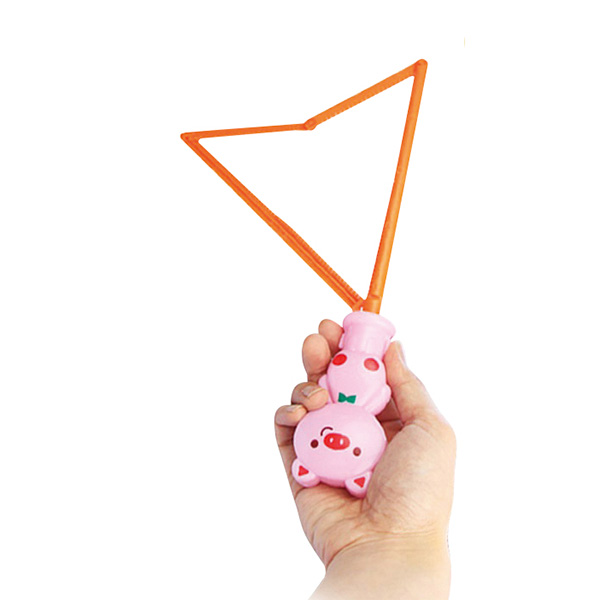 マスコットの付いたスティックを傾けると、パカっと三角形に開いて大きなシャボン玉が作れます。