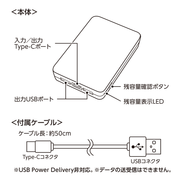 | 備考 | 最大出力2.1A バッテリー容量2750mAh 本体重量約117g <付属品> 取説付 Type-Cケーブル付属 残量表示ランプ付 |