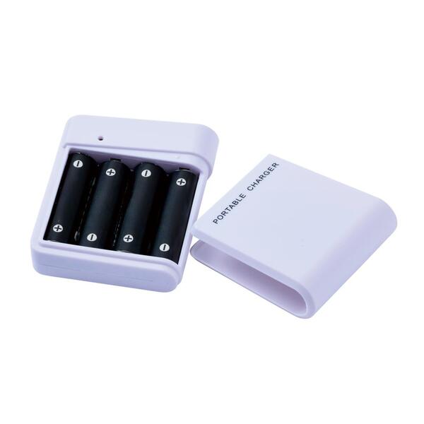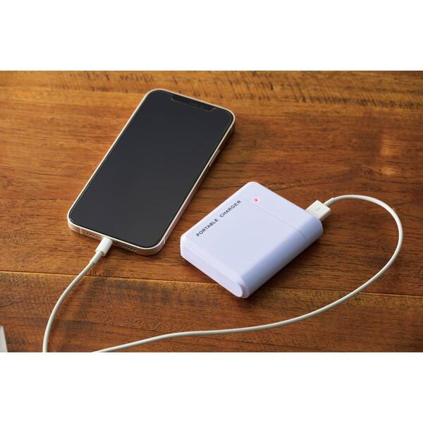 フルカラー印刷が際立つホワイトボディーのモバイルバッテリー。停電時も心強い乾電池式。
