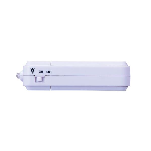 単3型乾電池4本で充電可能。LEDライト付きで緊急時に手元を照らすのに便利です。
