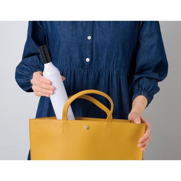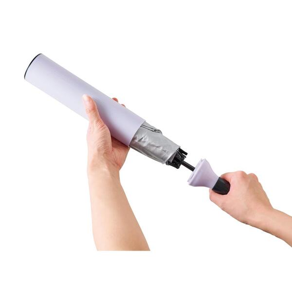 まるでワインボトルのような形のスタイリッシュなハードケースに入った晴雨兼用傘。