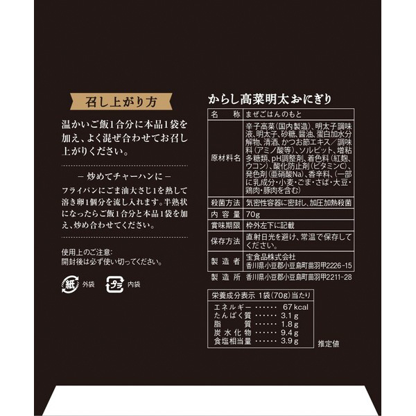 | 備考 | 【カートン割れ不可】 60個(30×2カートン)単位でのご注文になります。 【軽減税率8%】 ※自動見積では消費税10%で表示されますが、商品は軽減税率8%となります。 送料が発生する場合は、送料のみ消費税10%となります。 <セット内容> からし高菜明太おにぎりの素70g(1合用) ※おにぎり約2個分相当 賞味期間/360日間(常温) |