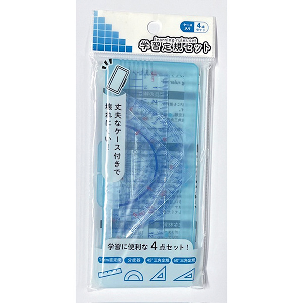 15センチ定規、分度器、直角二等辺三角形、直角三角形の4種類が入っております。