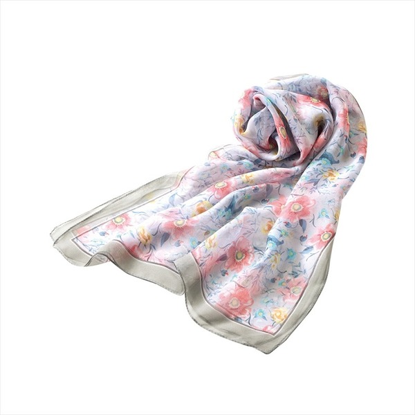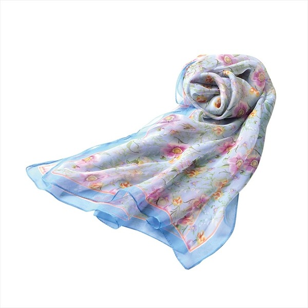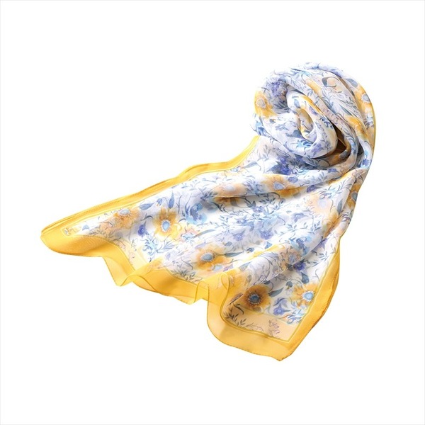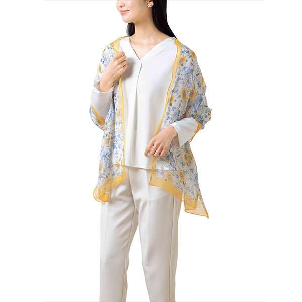 ふんわり軽やかなシフォン素材。華やかな花柄と縁のラインがアクセントになり、顔周りを明るく彩ります。