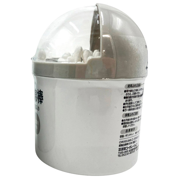抗菌剤を施した紙軸の白綿棒が、蓋付きで取り出しやすい容器に入っています。