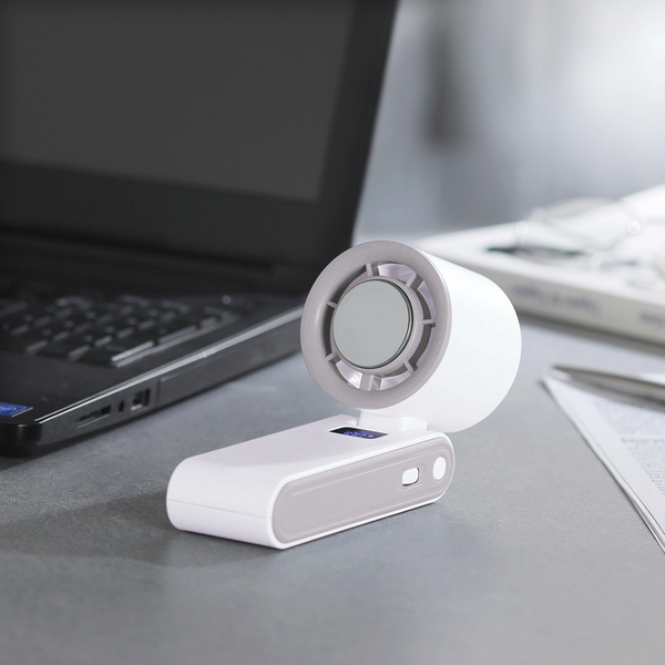 卓上、首掛け、ハンディの3WAYで使え、不使用時は折りたためばコンパクトに!