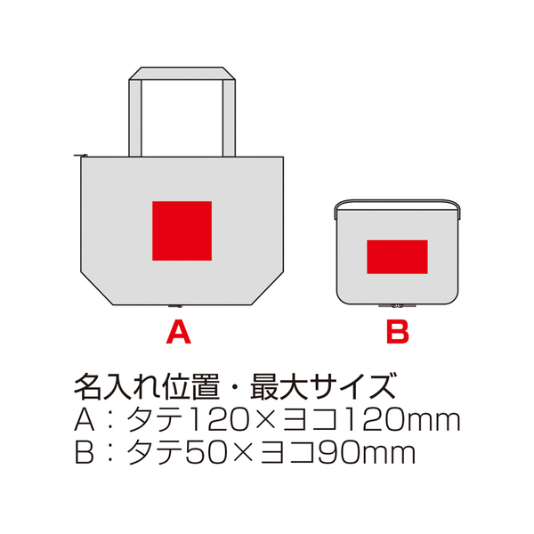 | 印刷・範囲 | シルク印刷 A:H120×W120mm B:H50×W90mm ※自動見積りは1箇所印刷のみとなります。 2箇所印刷ご希望の場合は、お問合せフォームよりご連絡ください。 |