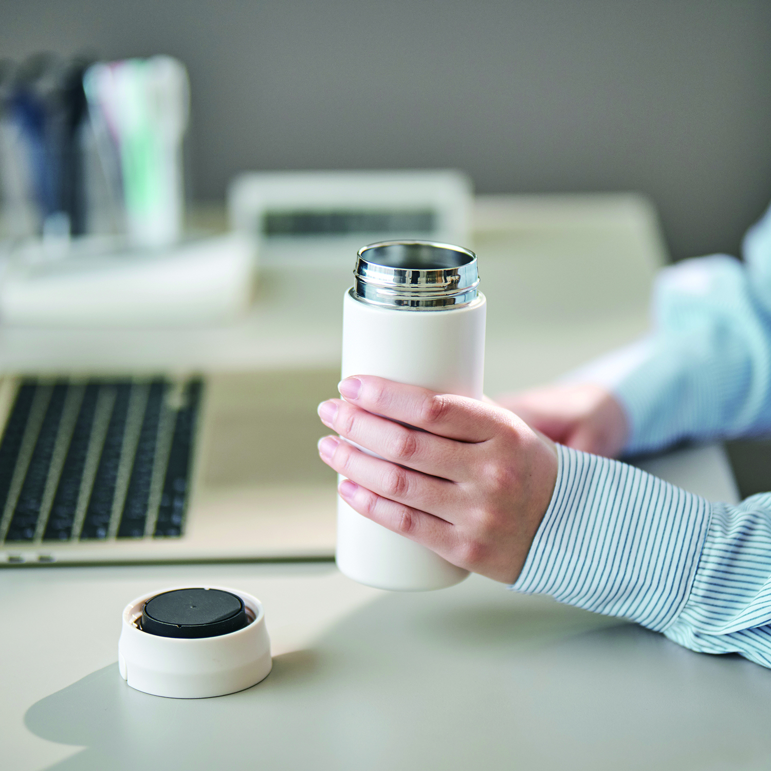 ハンドルが付いていて持ちやすく、蓋がシームレス化(一体化)したステンレスボトル。