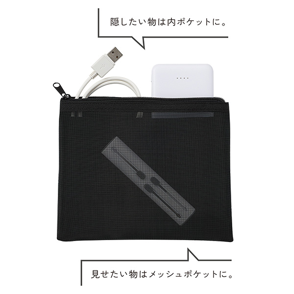 メッシュ×テントクロスの2層構造により、見せたい物と隠したい物を分けて収納可能。