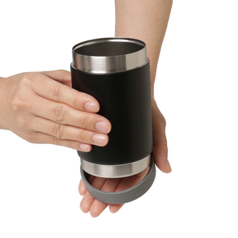 夏は冷たい缶をホールド、また直飲みでもサーモタンブラーとしてもお使いいただけます。オリジナル形状のシリコンキャップで市販の350mlの缶をぴったり固定できます。タンブラーとして使用する際は底面にシリコンを取り付けて滑り止めとしてお使いください。ボディはザラっとしたシボ塗装を施している為、持っても滑りにくい仕様です。ステンレス真空2層なので結露しないため水滴でバッグや机を濡らす心配なくご使用いただけます。