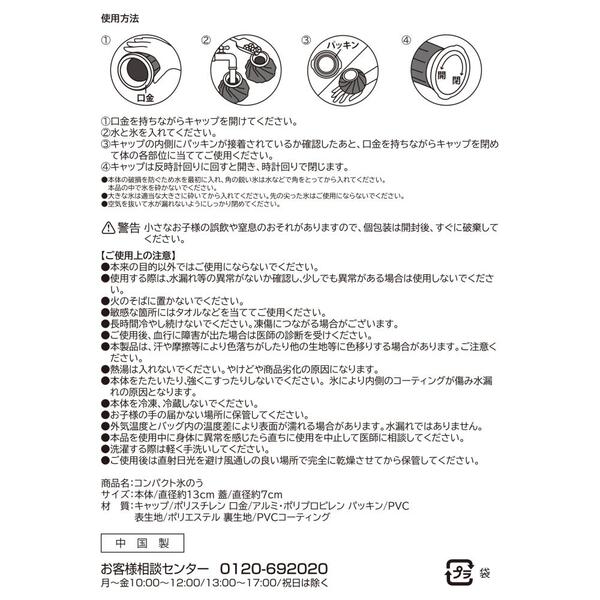 | 素材 | 表生地/ポリエステル、裏生地/PVCコーティング、キャップ/ポリスチレン、口金/アルミ・ポリプロピレン、パッキン/PVC |