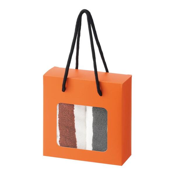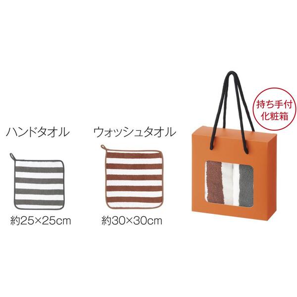 カジュアルなストライプ柄のタオルセット。中身が見える、あざやかなオレンジ色の持ち手付き化粧箱入り