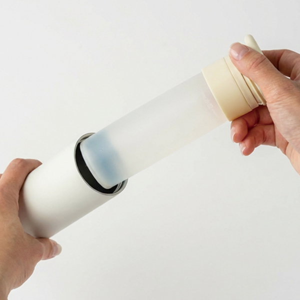 外側は魔法瓶タイプの真空二重構造で内側のシリコーンゴムに水を入れて凍らせれば、冷たさを長時間キープします。