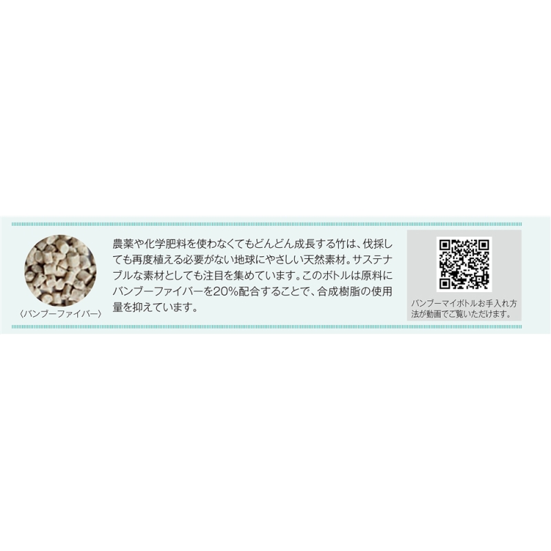天然素材を配合して作られた、使いやすく携帯しやすいマイボトル農薬や化学肥料を使わなくてもどんどん成長する竹は、伐採しても再度植える必要がない地球にやさしい天然素材。サステナブルな素材としても注目を集めています。このボトルは原料にバンブーファイバーを20%配合することで合成樹脂の使用料を抑えています。※コールド専用お手入れ方法の動画をご用意しています。